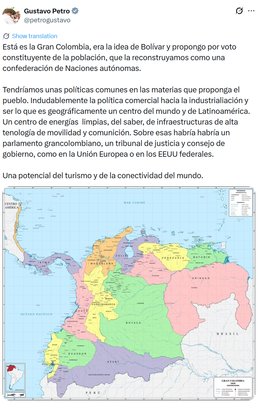 当地时间1月10日,哥伦比亚总统佩特罗在社交平台X发文,提议重建大哥伦比亚共和国。佩特罗写道,“我提议通过全民的制宪投票,将其重建为一个由自治国家组成的邦联。”