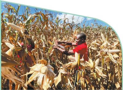 马拉维利萨萨齐县农业技术人员采摘玉米。