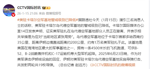 据路透社今天(1月15日)援引三名消息人士的话称,美军驻卡塔尔乌代德空军基地的警戒级别已降低。卡塔尔国际媒体办公室14日发表声明,证实美军驻扎在乌代德空军基地部分人员正在撤离,并表示相关举措是为应对“当前地区紧张局势”。乌代德空军基地位于卡塔尔首都多哈西南约35公里,距离伊朗边境直线距离约200公里,约有1万名美军驻扎于此。该基地是美国在海湾地区最大的军事基地之一,拥有一条4500米长的飞机跑道,可供B-52、B-2战略轰炸机和C-17运输机等大型军机起降。2025年6月23日晚,作为对美军袭击伊朗核设施的回应,伊朗对美军驻卡塔尔乌代德空军基地实施导弹打击,共发射两轮共19枚导弹。(总台记者 赵远方)