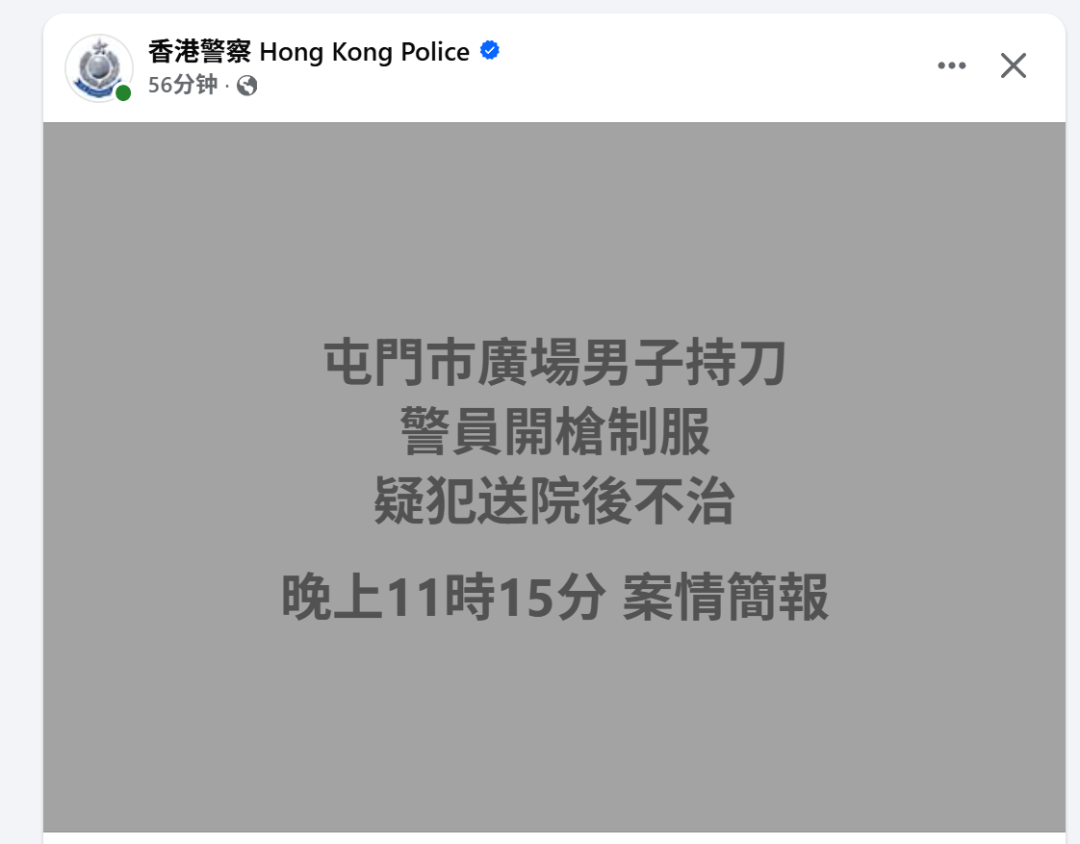 AI摘要:广州日报新花城记者15日晚间了解到,香港警方在晚上7时许获悉,一名年龄30岁至40岁男子在屯喜路屯门大会堂附近持刀挟持人质,有警员到场开枪制服疑犯,人质得到解救。记者了解到这名持刀男子晚上7时许现身屯顺街屯门市广场附近。文/广州日报新花城记者:曾毅、叶作林广州日报新花城编辑:黄琦