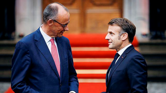 资料图:2025年5月7日,法国巴黎,法国总统马克龙会见德国总理默茨。 IC Photo