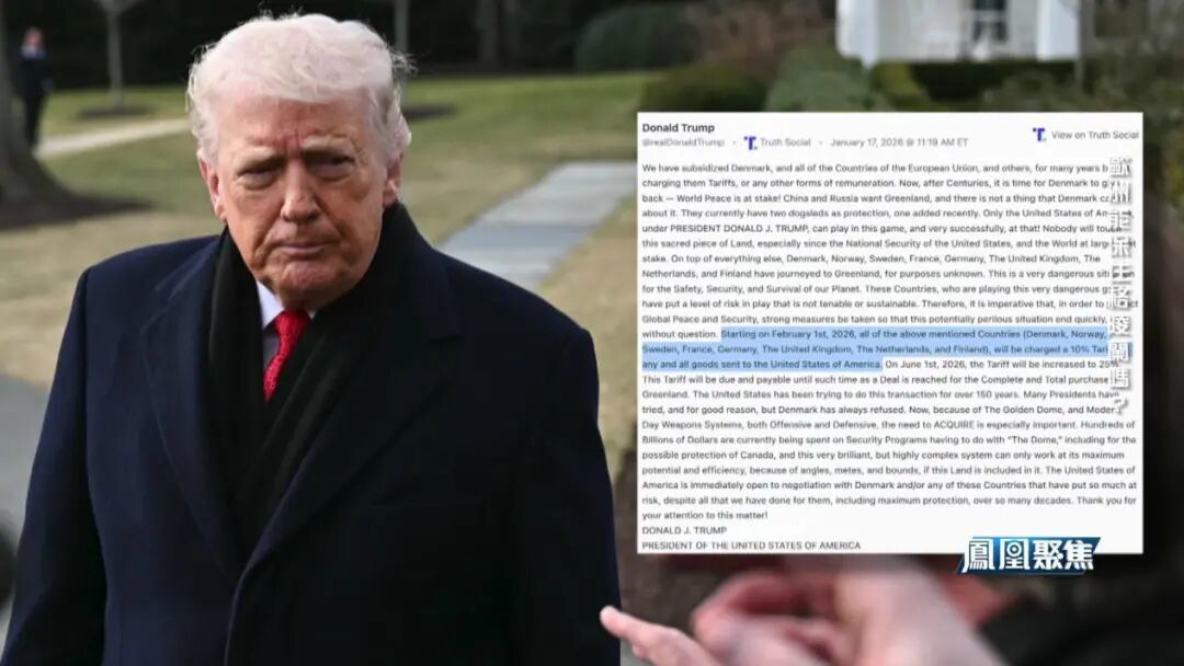 这两场游行的导火索,源于美国总统特朗普在当地时间1月17日发布的社交平台贴文。他宣布,自2026年2月1日起,对丹麦、挪威、瑞典、法国、德国、英国、荷兰和芬兰出口至美国的所有商品加征10%的关税,到2026年6月1日,关税税率将提高至25%。