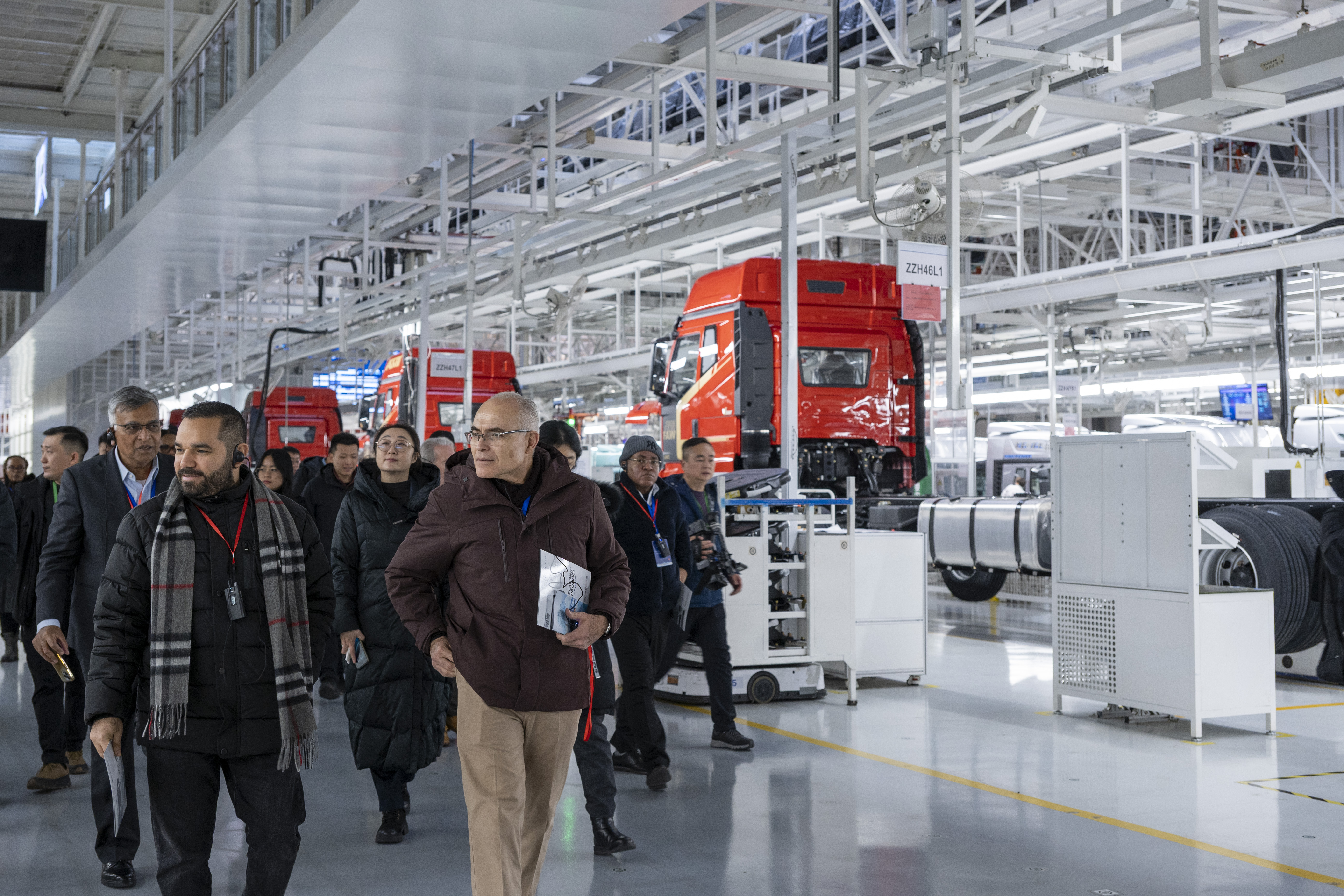 2025年12月16日,驻华使节代表团成员在长春一汽解放J7整车智能工厂参观。(新华社)
