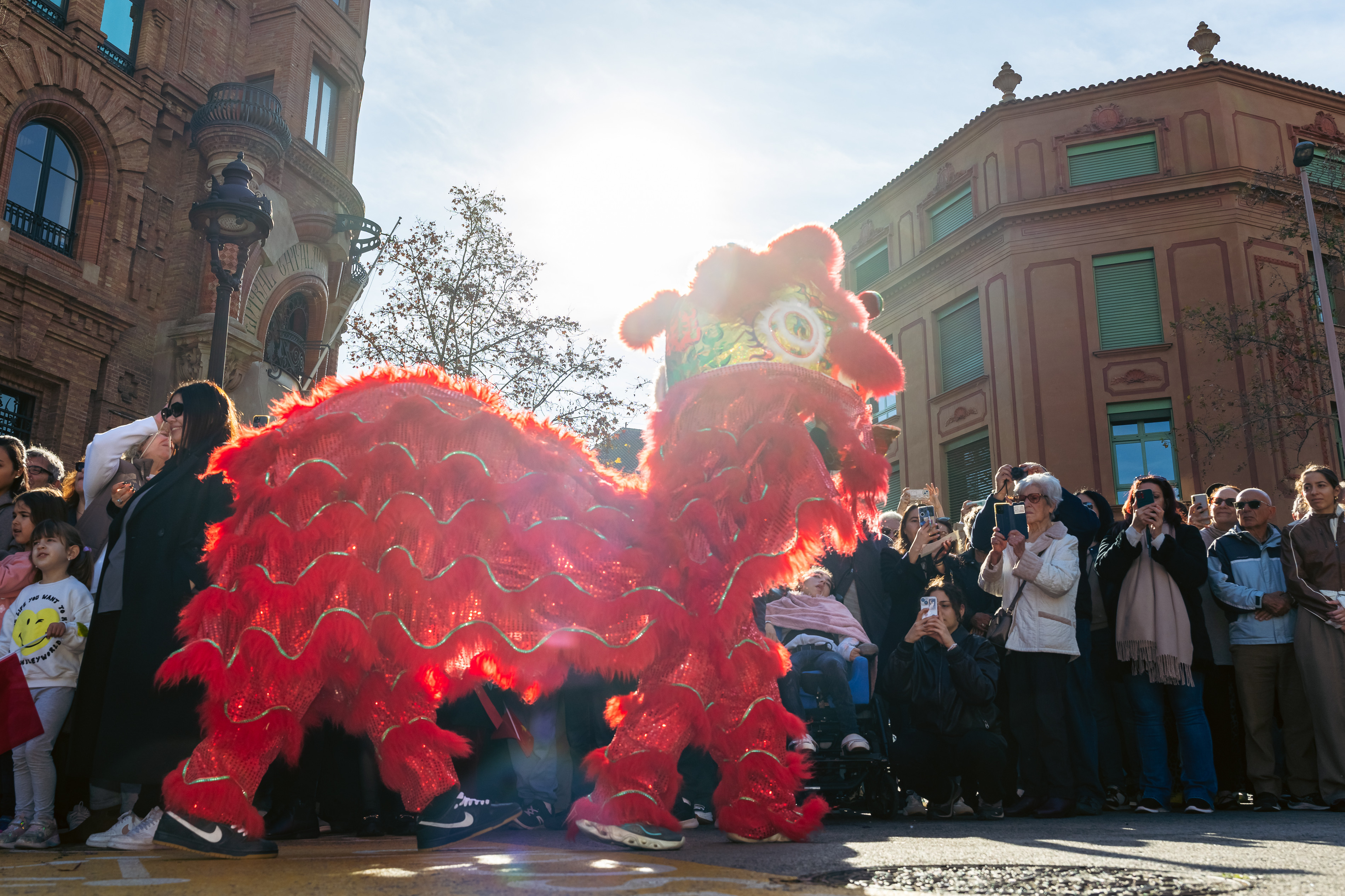 2025年1月25日,在西班牙巴塞罗那,演员在“与巴塞罗那共庆新春佳节”活动上表演舞狮。(新华社)
