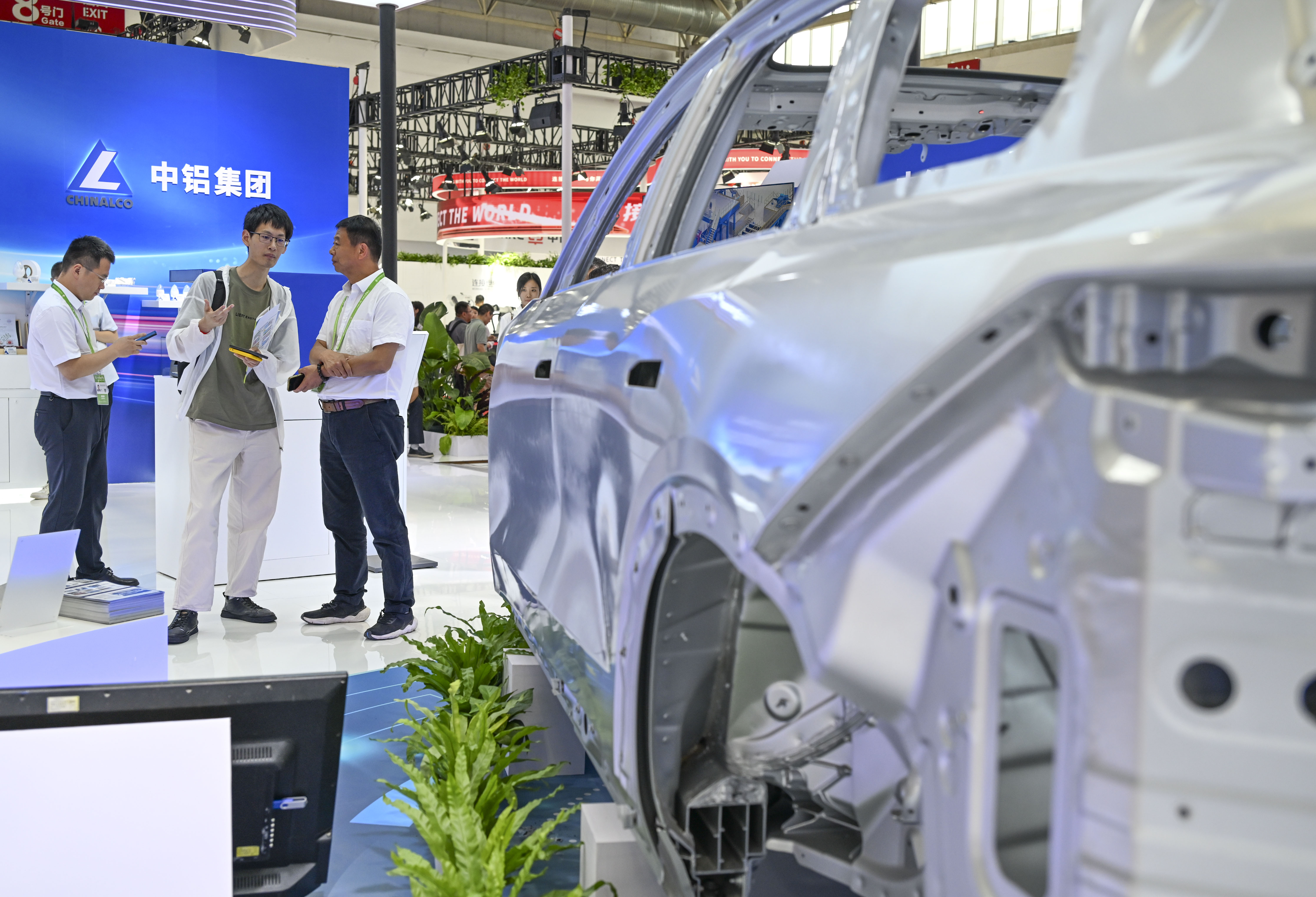 2025年7月16日,观众在先进制造链展区中国铝业展台了解一款全铝车身材料。该材料具有重量轻、防腐防锈、易于再循环等优点,目前在部分国产新能源汽车上得到应用。(新华社)