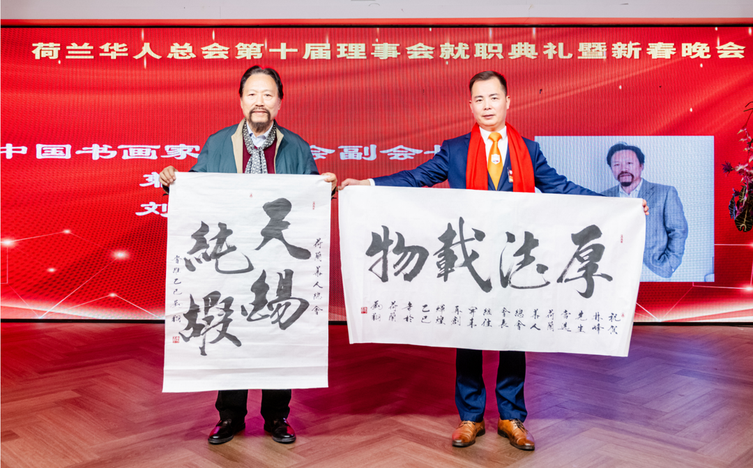 摘要:1月19日晚,荷兰华人总会(以下简称“总会”)总会成功举办荷兰华侨华人庆祝中华人民共和国成立74周年庆典大会、中秋联谊会、文化讲座等活动,积极与其他社团合作,共同举办大型活动,弘扬中华文化,促进多元融合;二是高度重视中华文化的弘扬传承,举办青少年暑期联谊会、三八国际妇女节庆祝活动、年度敬老爱老等活动,积极参与当地社会多元文化活动,推动中荷文化交流;三是维护华人权益,帮助华人提升社会地位。中国书法研究院副院长刘翔(左)向林峰会长(右)赠送书法作品