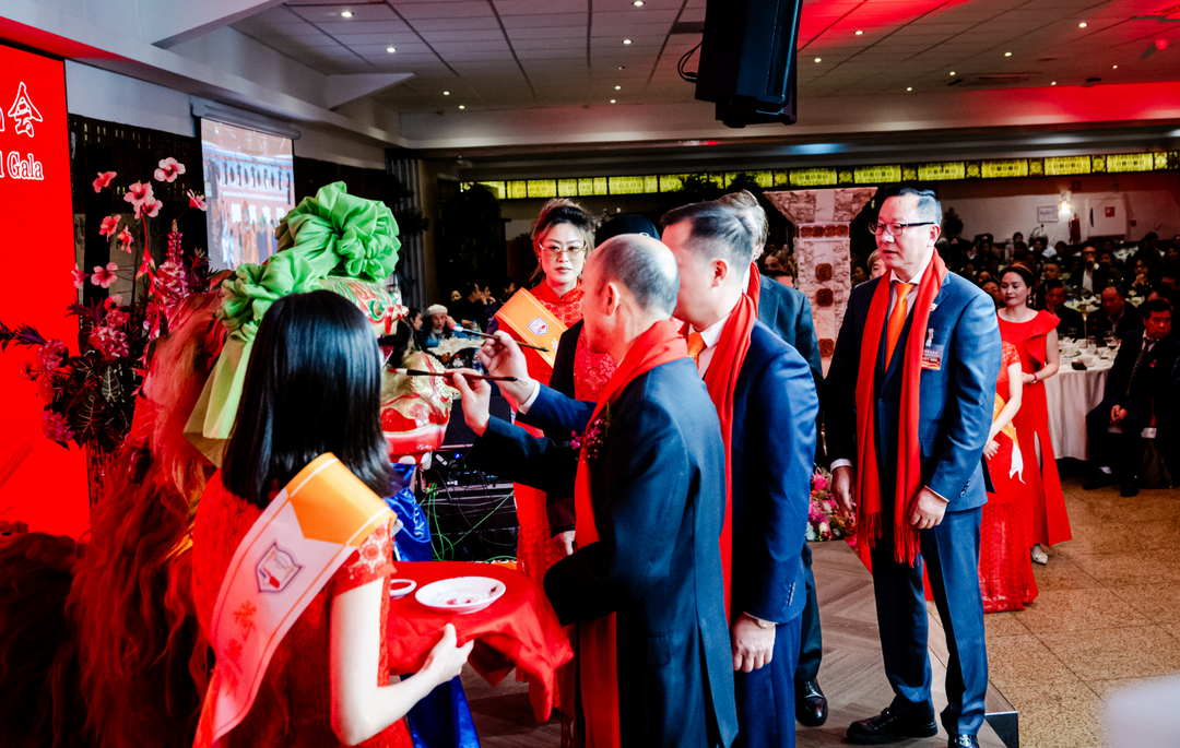 荷兰费氏武术学院团队表演了精彩的舞狮,新任会长林峰、卸任会长胡闽生、何时晴参赞和范德飞秘书长为醒狮点睛。