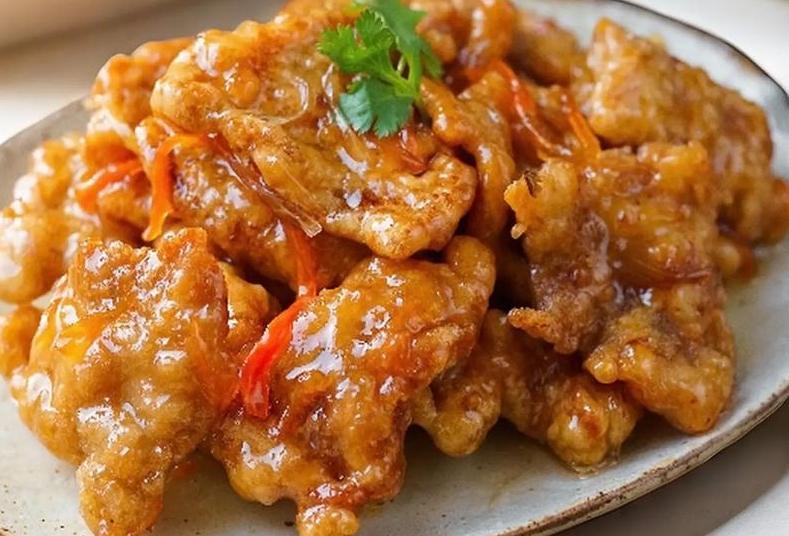 猪里脊切薄片,用少许盐和淀粉抓匀,调一碗生抽、醋、白糖、清水的料汁,锅中倒油把肉片炸至金黄捞出,留底油炒料汁,熬至粘稠倒肉片翻炒挂匀汁即可