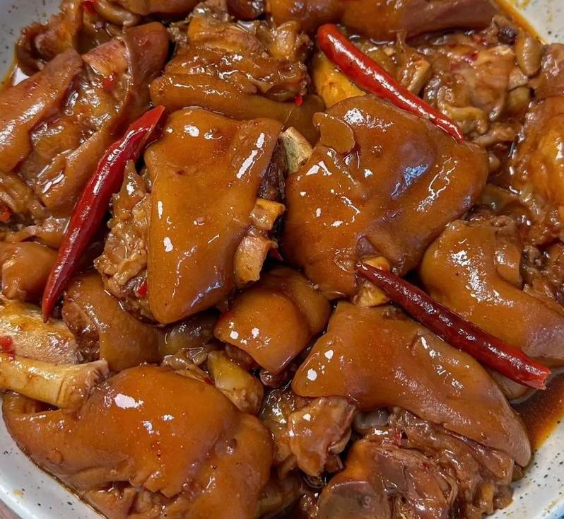 猪蹄焯水捞出,锅中倒油炒糖色,下猪蹄翻炒至上色,加葱姜、八角、生抽和清水,大火烧开转小火炖一小时,最后开大火收浓汤汁,尝味补点盐就可以