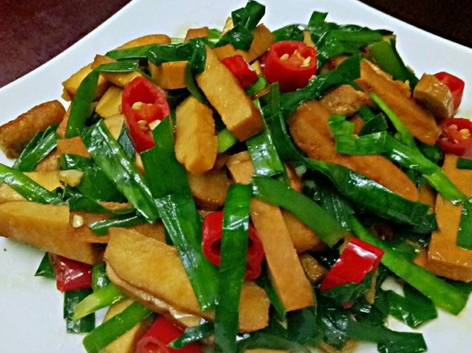 豆干切细条,韭菜洗净切段,锅中倒油先炒豆干,加少许生抽调味炒香,再下韭菜快速翻炒,韭菜变软后加一点点盐,翻炒均匀就关火,别炒太久影响口感