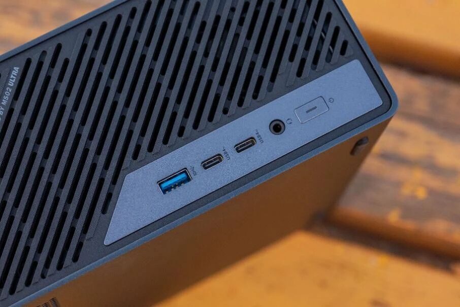 机器正面提供两个USB4 V2(80Gbps),一个USB-A,以及一个耳麦孔。这也是我第一次在Intel的机器上见到USB4 V2,速率直接翻倍,快有雷电5的水平了。