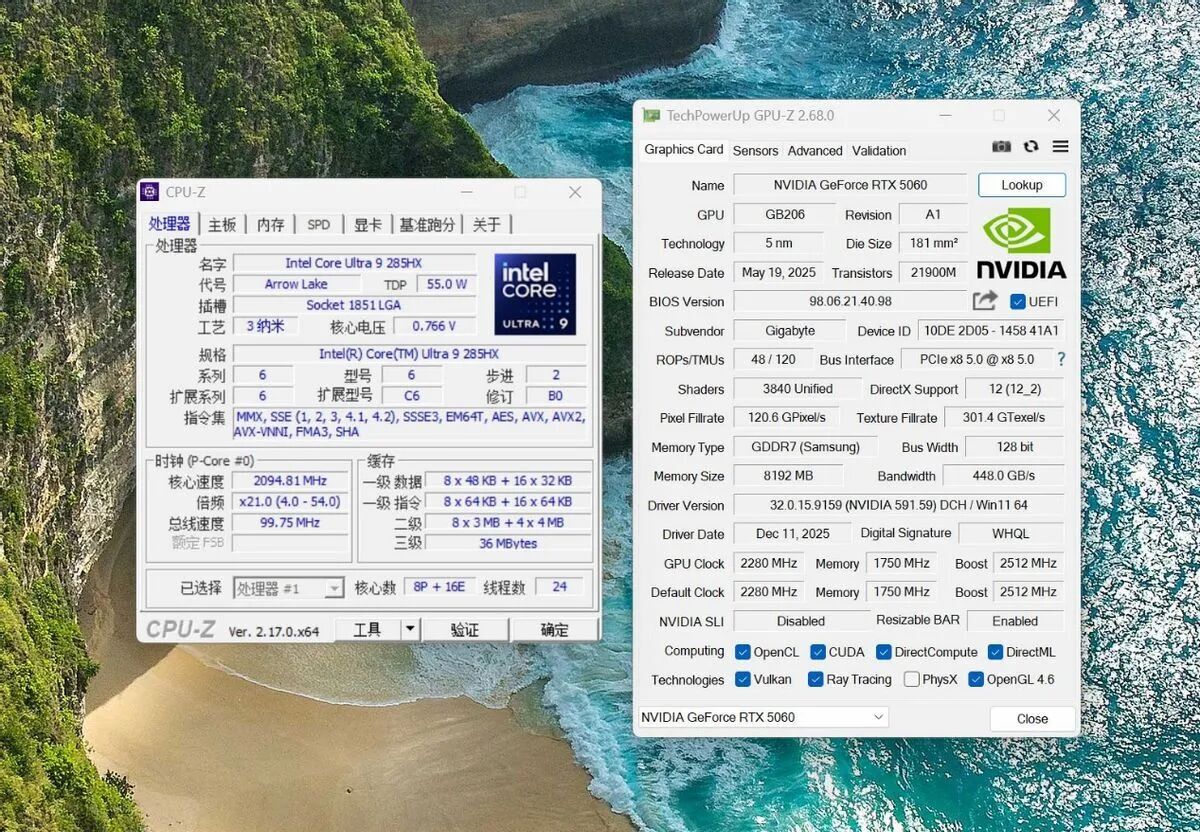 装好之后的CPU和显卡信息如下,标准的5060桌面版,3840个流处理器,8GB的GDDR7显存,显卡驱动已经更新到了最新。