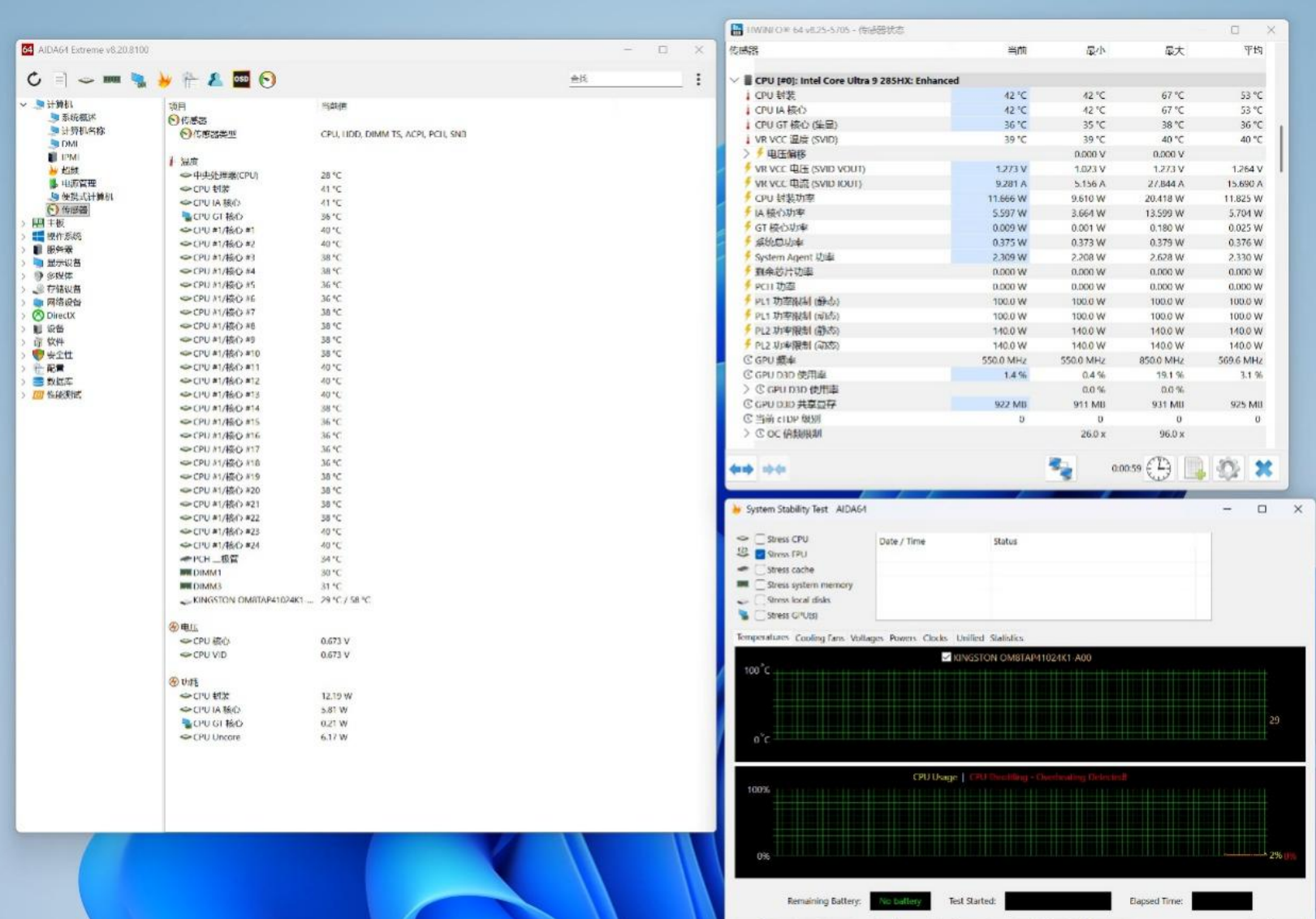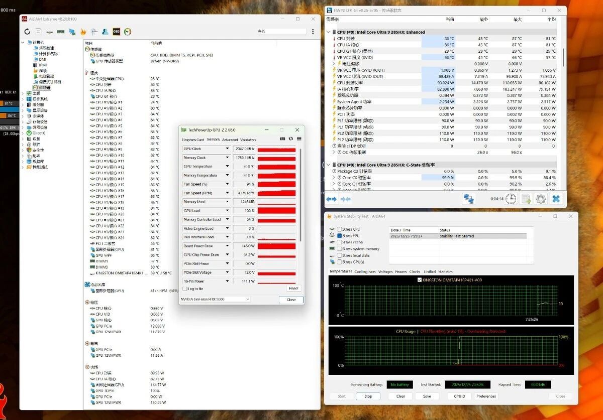 单烤FPU,CPU满载功耗稳定为100W,峰值140W。这对笔记本来说,已经是非常高的功耗了,但是对MS-02 Ultra来说,散热余量还很大。此时CPU温度为86℃,但是噪音仅有45.9分贝,说明CPU散热完全没压力,这也能理解为什么铭凡敢让你自己调CPU的功耗值了,有信心啊!