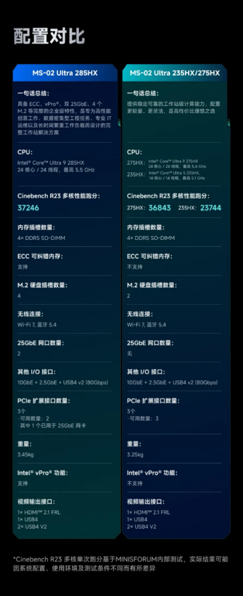 我拿到的是285HX的版本,也就是满血版,支持vPro,ECC内存,最大4个M.2插槽。后续会上架275HX和235HX的版本,但是砍掉了ECC,vPro,以及标配的25G网卡,M.2插槽也降低到了2个。所以就个人感觉,285HX的版本反而是最值得购买的。