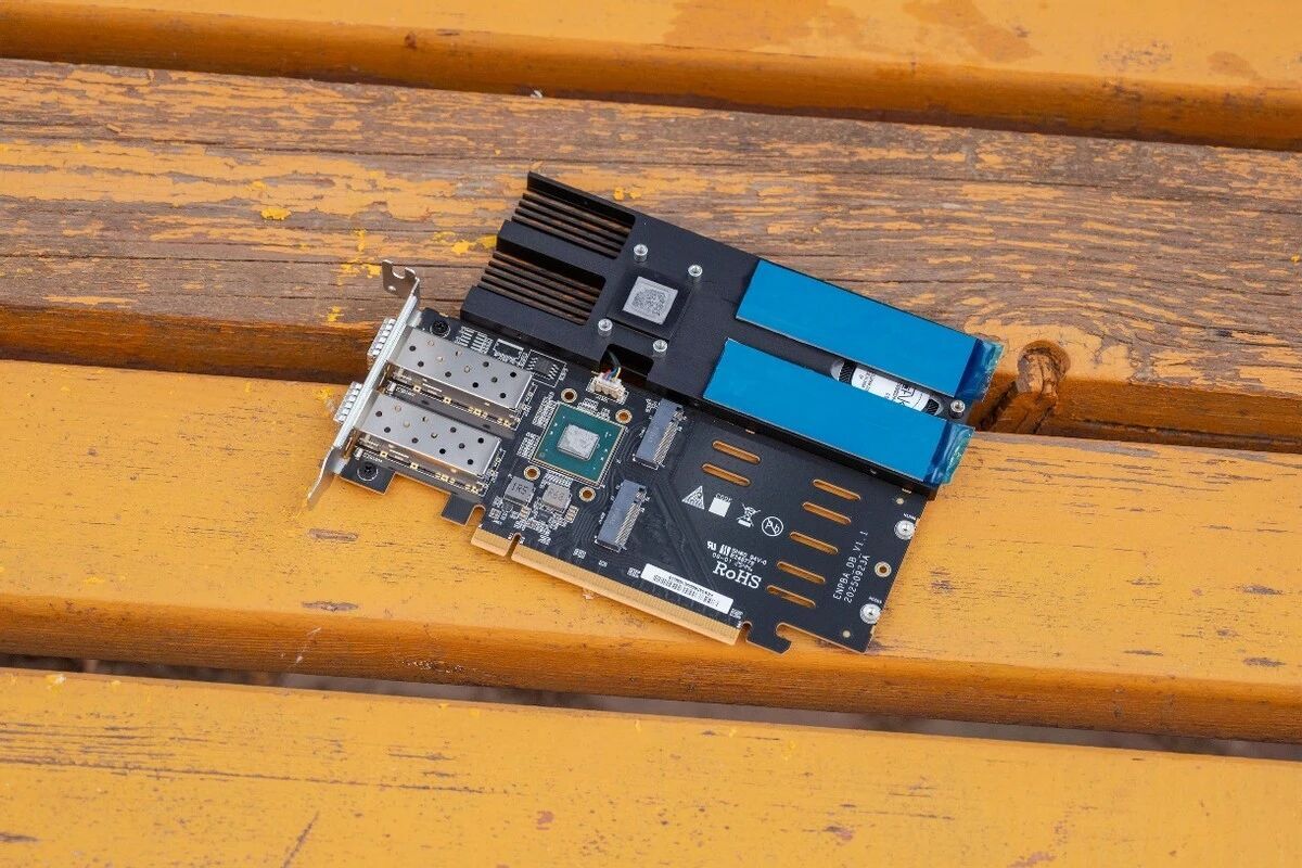 拿掉以后可以看到,这块板子上不仅提供了双25G网口,还提供了剩余的两根M.2插槽。这也就不难理解,为啥砍掉了双25G之后,M.2插槽也少了俩。要注意的是,这是通过主板的PCI-E通道拆分功能实现的,不是谁都能用。网卡芯片看外形应该是Intel的,具体是什么上机就知道了。