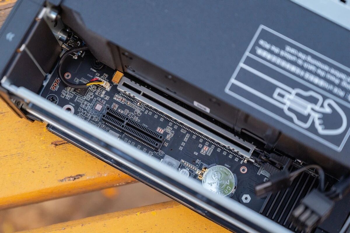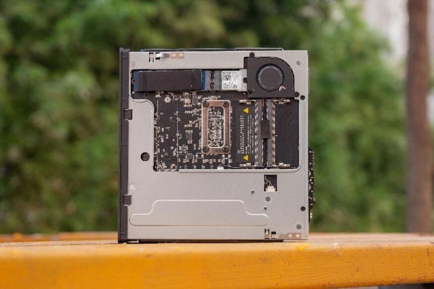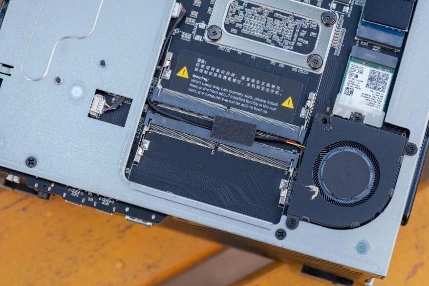 机器背部如下,提供了两个M.2 2280的接口,两个内存槽,同时网卡也在这一侧。此外,还提供了一个小风扇用于给这些硬件散热,保证稳定性。