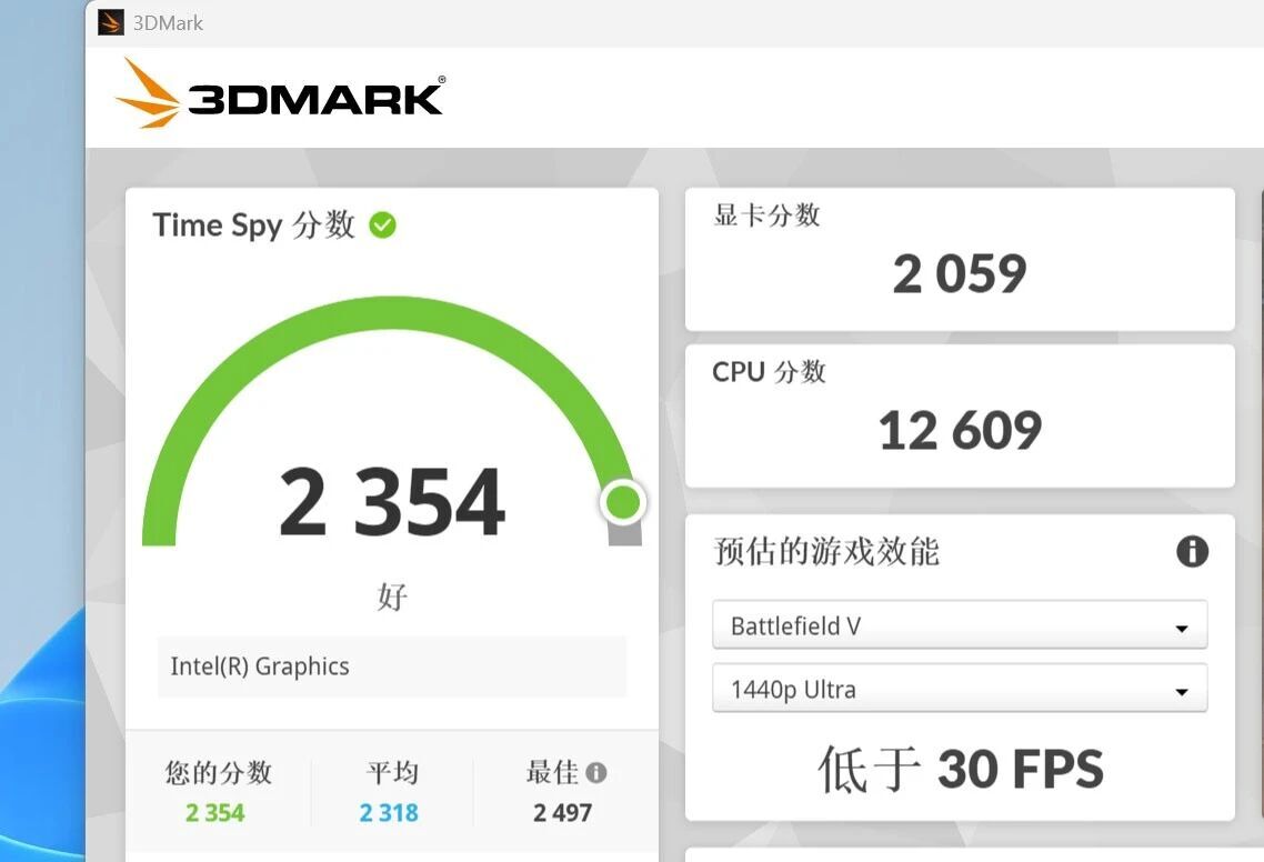 核显性能如下,因为只有4个Xe核心,所以肯定比不了H45的8Xe核显,但是2000分的分数玩玩LOL,原神这类游戏还是OK的,实在不行,咱还能加一张5060级别的刀卡不是。