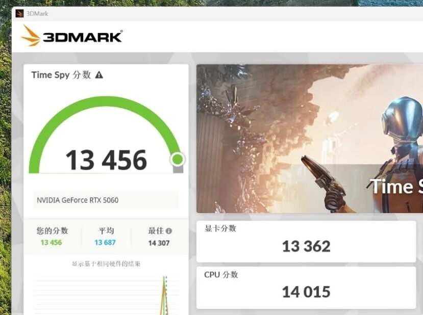 简单测一下显卡表现,3Dmark分数为13300分,属于正常的5060表现,没有因为刀卡就导致显卡性能下降。