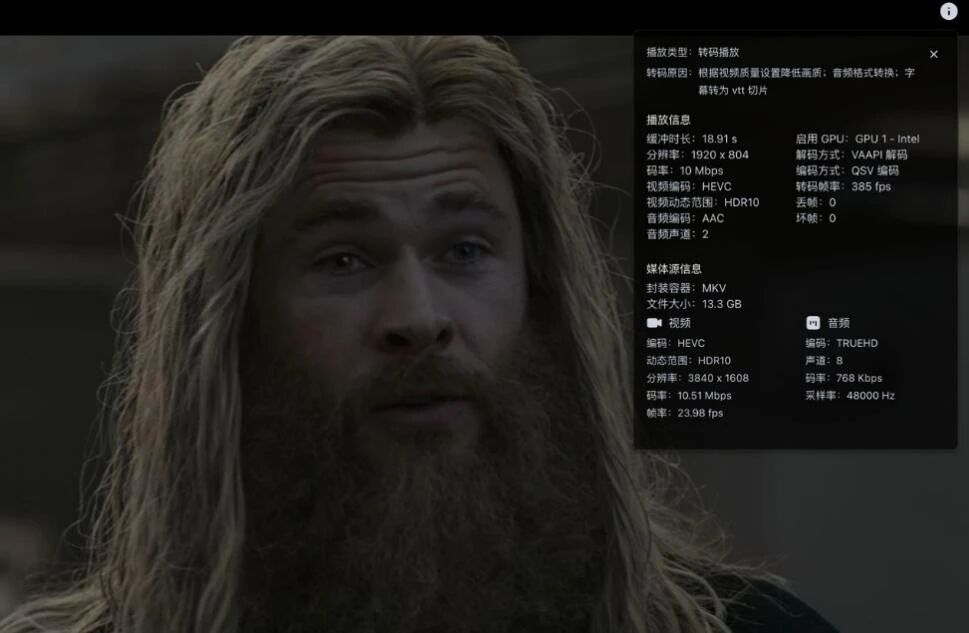 不过核显倒是已经可以完美支持, 使用飞牛自带的影视中心,可以看到正确调用了285HX的核显进行转码,速度还非常快,接近400fps了。不过……这台机器跑飞牛,真的可以说是大炮打蚊子了,建议还是在虚拟机里面就行了,作为all in one的一部分吧。