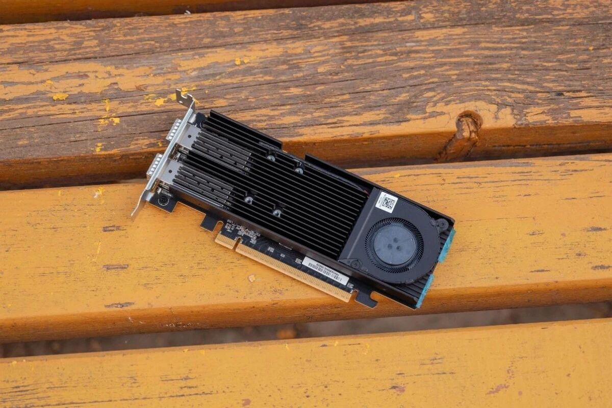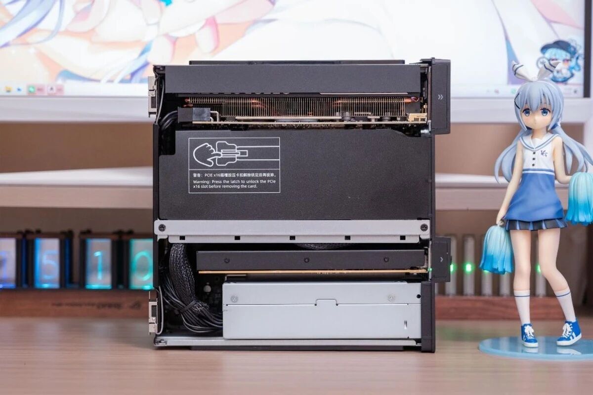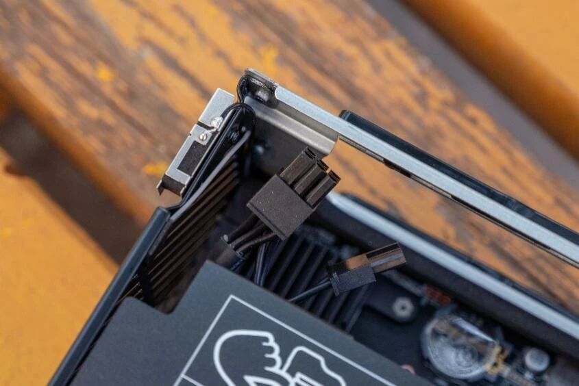 标准的双槽刀卡尺寸,三颗小风扇负责散热。其实搭配这个机器的话,我更推荐蓝戟刚出的那张单槽Arc刀卡,16GB显存!