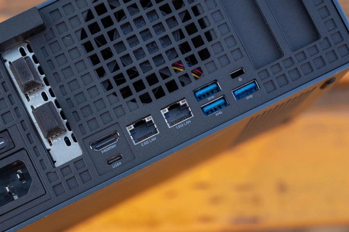 两个电口网口分别为2.5G和10G,其中2.5G为Intel的i226LM芯片,支持vPro管理功能,10G芯片则是螃蟹的8127,下方是一个USB4接口和一个HDMI2.1接口。