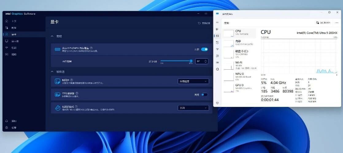 另外值得一提的是,Intel核显驱动更新到最新以后,可以通过驱动调节GPU的显存量了,这让Intel的核显和NPU可以用更多的内存去跑AI,这台机器上可以最大拉取到87%的容量,如果你的内存够大的话,我记得拉到94%以上都是没问题的。