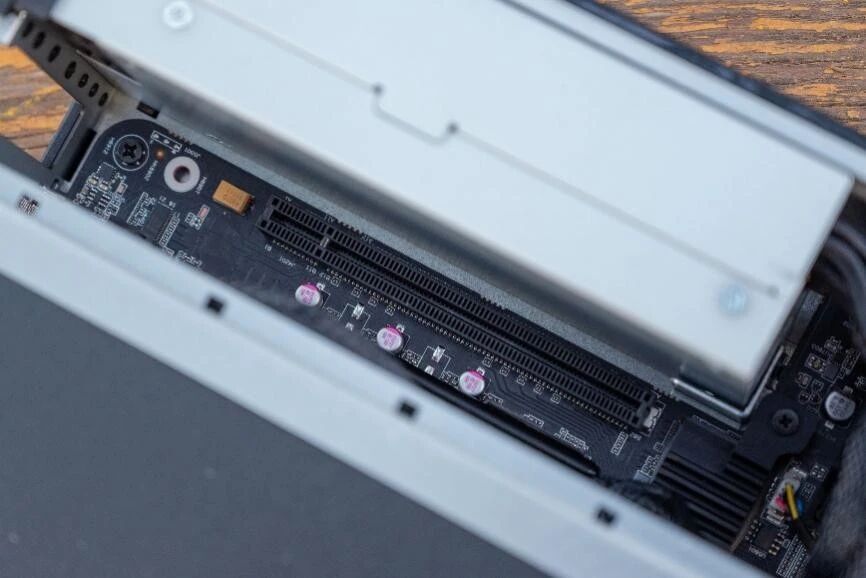 机器顶部是两根PCI-E插槽,第一根为标准的PCI-E5.0x16插槽,可以用来扩展显卡。第二根是开放式的PCI-E4.0x4插槽,用来扩展网卡,存储都是OK的。如果你打算用5060刀卡的话,x4的插槽是用不了的,想用可以使用telsa P4z这类单槽刀卡。总之玩法是非常多的,看你需求。