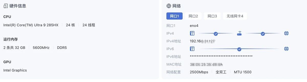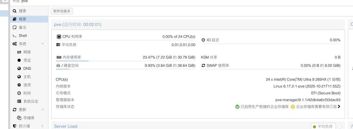 当然,作为一台多网口工作站,我也试了一下PVE的兼容情况。目前最新的PVE9.1已经可以完整支持285HX处理器,所有的硬件都可以正常识别。包括两张25G的网卡,8127的万兆,甚至雷电5都可以正常识别到,PVE的硬件支持做的还是相当OK的。至于性能……都285HX了你还担心性能?