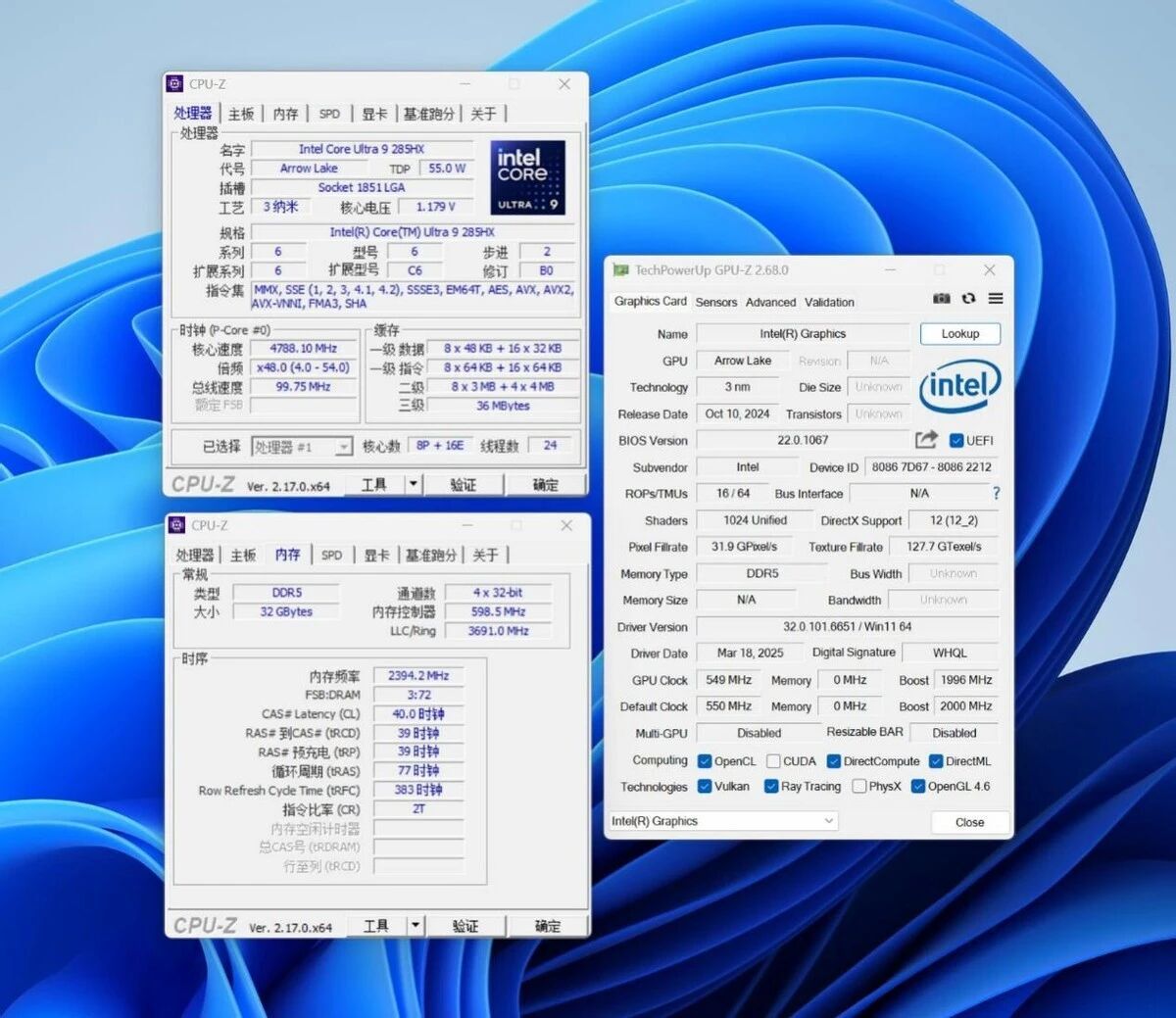 机器的信息如下。标配的285HX是Intel 200HX处理器里面的旗舰型号,8P+16E的规格,24核心24线程,最大睿频5.5GHz。标配的核显有4颗Xe核心,支持AV1编解码。不过由于没有XMX单元,所以GPU的最高AI算力只有8Tops。不过算上NPU的13Tops算力和CPU的AI算力,整颗CPU的AI算力还是有36Tops的,并不低。标配的内存是32GB双通道5600内存,但是对这种工作站来说,我觉得最起码选个64GB吧。