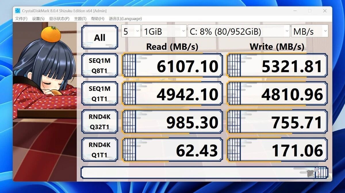 跑分如下,由于是无缓SSD,所以跑分一般,但是也足够用了。
