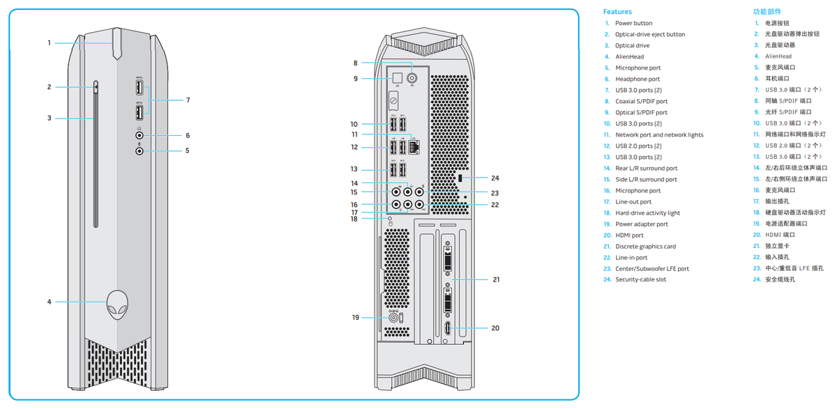 上图是X51 R2机型的全部接口提示,由于示意图中的机型搭配了独立显卡,所以主板上的HDMI接口并未指示出来,或者说这个机子压根就没有不带独立显卡的选项,这个HDMI接口就是给你应急用的。