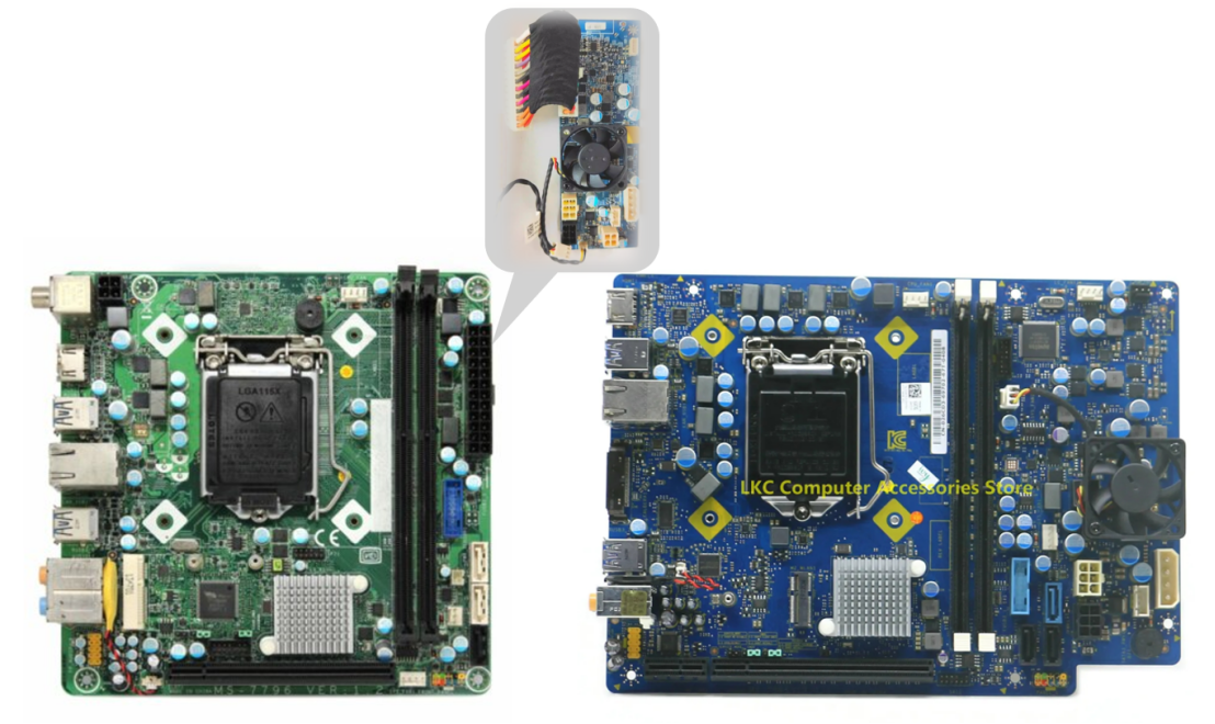 X51的体积非常小巧,产品定位是小体积游戏PC。其中,R1及R2机型内部使用的主板为标准ITX规格(上图左),分别采用H61(支持2/3代酷睿i,蓝色PCB)、H87(支持4/4R代酷睿i,绿色PCB)芯片组,主板右侧搭配1块独立的专用电压调节及灯光控制副主板。R3机型(Z170芯片组,支持6/7代酷睿i)的主板就和副主板连成一体了(上图右)。