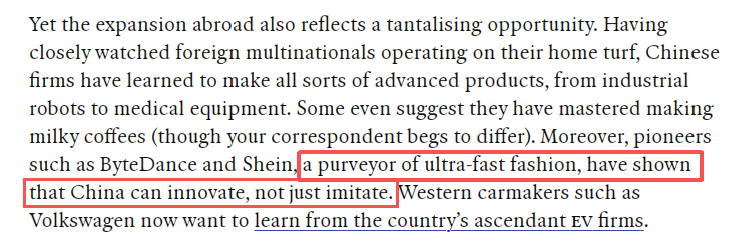 英国《经济学人》杂志近期发表的文章说,新一代中国企业正以不同以往的方式走向全球。英国《经济学人》报道截图文章说,几年前,人们还很难想象中国品牌能在美国大获成功。然而如今,曼哈顿的购物者可以走进中国服装零售商2800平方米的门店,选购在TikTok上爆红的潮流服饰;随后再来一杯中国品牌的咖啡(去年登陆纽约),或一支中国连锁品牌的冰淇淋。文章分析认为,中国企业在海外的影响力正逐年增强,覆盖国家多元,涉足行业日益广泛。去年中国某电动汽车制造商的销量超越了美国龙头特斯拉。中国AI模型正被全球采用,不仅受发展中国家青睐,一些西方企业也在使用。英国《经济学人》报道截图文章说,这轮全球化浪潮的广度与速度同样惊人。2024年中国上市公司海外营收达2.1万亿美元(约合15万亿元人民币),较2021年显著增长。当前中国对外直接投资已超过外商对华投资。但更引人注目的是,在地缘政治紧张的背景下,中国企业正改变出海策略,更注重实体布局。中国企业已掌握从工业机器人到医疗设备的高端制造,新一代品牌更证明了中国创新能力。如今欧美车企反而开始向中国电动汽车车企取经。英国《经济学人》报道截图文章认为,为赢得海外市场,中国企业正重塑商业模式:企业出海:面对成本上升和关税压力,企业加速在发展中国家建厂;品牌建设:多家中国品牌在全球具有影响力;本土运营:中国品牌成为当地最受欢迎的产品;人才本地化:更多外籍员工担任销售、公关甚至管理岗位。文章最后说,未来全球消费者或将邂逅更多中国品牌。来源|总台环球资讯