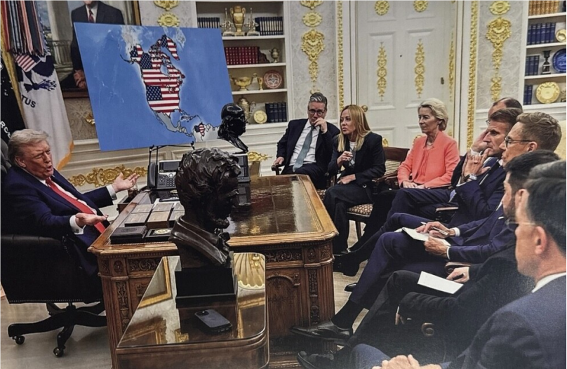 在特朗普发布的图片中,特朗普在白宫椭圆形办公室面对一众欧洲国家领导人及乌克兰总统、欧盟委员会主席等人,旁边摆放的地图,则将加拿大、丹麦自治领地格陵兰岛和委内瑞拉都涂上了星条旗图案。