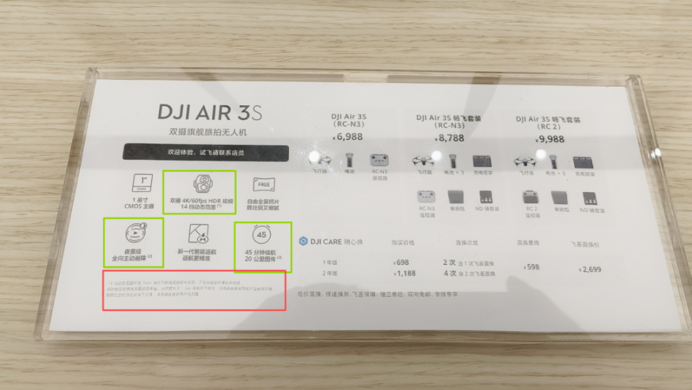 图中绿框部分为大疆该款产品的主要性能宣传,下方红框内的小字则列出了多项实现条件限制。(央广网记者孙文轩 摄)