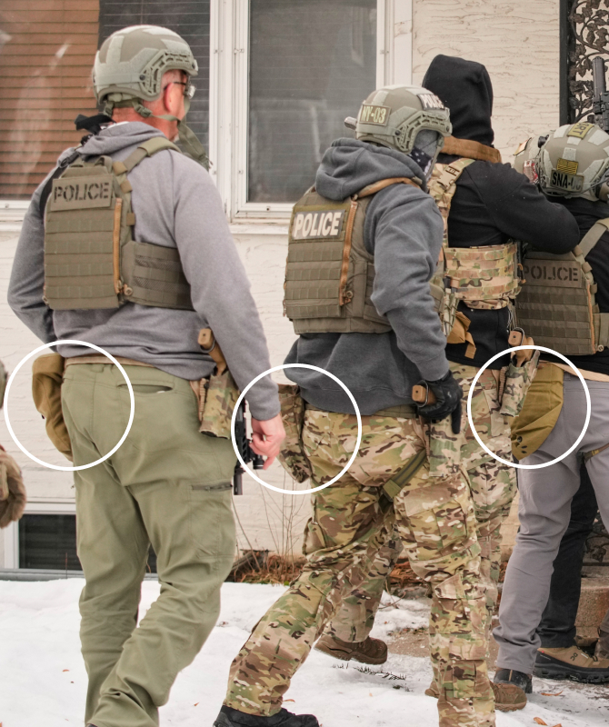 报道继续提到,照片中还出现“少数直接来自战场的战术装备”,比如执法人员腰带上佩戴的棕黄色及迷彩弹匣袋,这些弹匣袋通常用来存放用过的弹匣,但有时也装着食物或水。