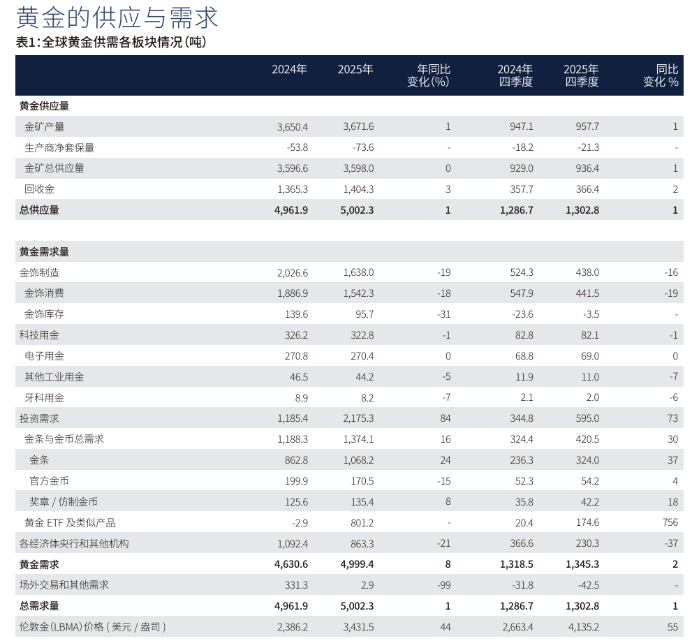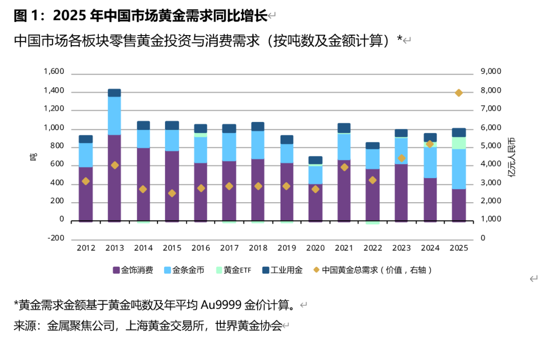 记者 孙铭蔚 2025年全球黄金总需求再创历史新高。 1月29日,世界黄金协会发布的2025年全年《全球黄金需求趋势报告》显示,2025年全球黄金总需求达5002吨,创历史新高。持续的地缘政治和经济不确定性推动了黄金投资需求的大幅攀升,这令全年黄金需求总金额达5550亿美元。 “2025年见证了全球黄金需求的激增和金价的大幅飙升。持续的经济和地缘政治风险已成为‘新常态’,消费者和投资者纷纷买入并持有黄金。黄金投资需求成为全年焦点,投资者通过各种可用渠道争相配置黄金,而其他细分领域也对全球黄金需求发挥了支撑作用。美元金价较上年同比大涨67%,但金饰需求仅下降18%,说明消费者在高金价环境下仍愿意购入金饰产品;同时,全球央行也坚定致力于增加黄金储备。” 世界黄金协会资深市场分析师Louise Street表示,“展望2026年,经济和地缘政治不确定性几乎没有缓解迹象,2025年强劲的黄金需求势头有望延续。今年伊始,黄金价格在首月便首次突破每盎司5000美元大关,再次凸显了在不确定时期黄金作为避险资产的重要作用。” 黄金需求量与金价齐破纪录 世界黄金协会数据显示,2025年全球黄金总需求量(含场外交易)首次突破5000吨。叠加年内金价屡破纪录的强劲走势⸺全年共计53次创新高,全球黄金需求总值飙升至前所未有的5550亿美元,同比增长45%。全年来看,推动黄金市场投资兴趣高涨的核心逻辑始终围绕着避险和资产多元化需求,金价的显著上涨同样引起广泛关注。 具体来看,全球黄金投资需求增至2175吨的里程碑水平,成为推动2025年黄金总需求刷新历史纪录的主要驱动力。全球范围内,寻求避险和资产多元化的投资者大量涌入黄金ETF,全年净增801吨,成为历史第二高年度增量。 同时,实物黄金投资需求也保持强劲,全球金条和金币需求达到1374吨,按价值计为1540亿美元,触及12年来峰值。其中,中国和印度市场表现突出,分别实现同比增长28%和17%,合计占该板块需求的50%以上。 央行购金方面,2025年全球央行净购金230吨,环比涨幅6%;全年,全球央行购金需求依然保持高位,官方机构增持863吨黄金。总体来看,购金规模仍处于历史高位,且购金央行分布广泛,但与过去三年相比,央行购金节奏有所放缓。 在金价接连刷新历史纪录的背景下,2025年金饰需求量下滑完全符合预期,全球金饰消费总量同比下降19%至441吨;全年全球金饰消费总量较2024年下降18%,至1542吨,但全球金饰消费金额却同比增长18%至1720亿美元的历史高点,充分说明全球消费者对金饰的兴趣并未消退。 此外,尽管消费电子领域出现波动,但受益于人工智能相关应用的持续增长,2025年科技用金需求保持稳定。 国内黄金ETF资产管理总规模、持仓量创历史新高 中国市场方面,世界黄金协会数据显示,2025年全年黄金需求总量达1003吨,同比增长6%,为2021年以来最高水平。按金额计,全年需求更是创下历史新高,总额达7960亿元人民币(约合1110亿美元),同比激增53%。值得注意的是,年内强劲的黄金投资需求抵消了金饰板块的疲软态势。 2025年四季度,中国市场黄金投资与消费需求(含金饰、金条、金币、黄金 ETF 及工业用金)总量达274吨,较2025年三季度大幅攀升60%,同时创下历年四季度第二亮眼表现,仅次于2016年同期。 金饰方面,2025年四季度国内金饰需求走弱,环比下降3%,同比下滑23%,至82吨。全年金饰需求总量达360吨,同比减少25%。不过,从消费金额维度来看,2025年四季度中国消费者金饰支出达778亿元人民币(约合110亿美元),同比增长19%;全年累计支出2814亿元人民币(约合394亿美元),同比增幅为8%。 值得注意的是,2025年四季度,中国黄金ETF新增510亿元人民币(约合54吨),创下单季度流入规模历史最高水平。这一表现进一步巩固了2025年中国黄金ETF市场的历史峰值地位,全年资金流入量达1100亿元人民币(约合133吨)。黄金ETF资产管理总规模(AUM)激增243%,升至2418亿元人民币;持仓量实现翻倍以上增长,增至248吨,两项数据均创历史新高。 展望2026年,世界黄金协会指出,若金价持续高企,消费者购买力问题将继续对金饰需求构成挑战。但市场普遍预期国内将采取降息及偏宽松的财政政策,预计将有助于提振消费者信心,总体上利好非必需消费的支出。特别是2026年一季度,中国市场金饰消费或出现环比回升,春节旺季(金饰商的季节性采购+消费者的节日购买)有望形成支撑。