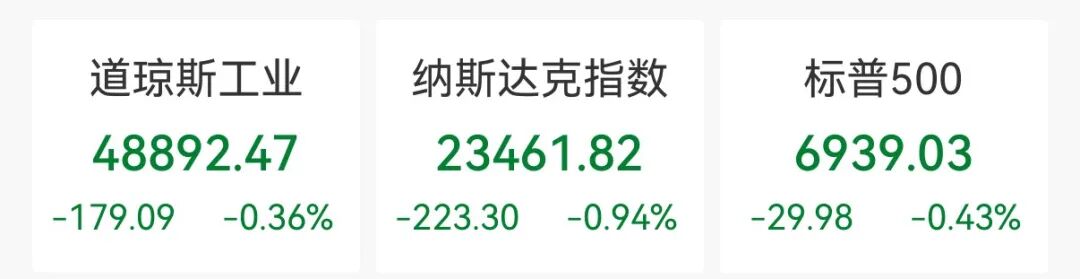 截至收盘,道琼斯工业平均指数跌0.36%报48892.47点,纳斯达克指数跌0.94%报23461.82点,标普500指数跌0.43%报6939.03点。