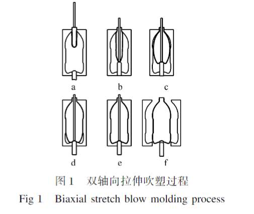 通过拉伸杆的轴向拉伸 + 高压吹塑的径向拉伸,