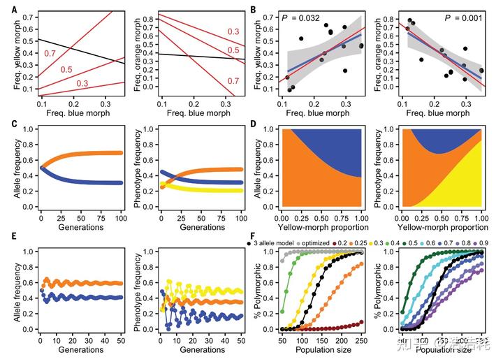 (模拟结果显示,两等位基因模型在广泛参数范围内都能维持多态性,且与 14 年野外观察数据高度吻合—蓝色和黄色形态频率呈正相关,而它们与橙色形态频率呈负相关。更重要的是,引入遗传漂变后,两等位基因 + 表型可塑性模型在各种种群规模下都比三等位基因模型更稳定。在种群规模为 100 的模拟中,三等位基因模型 91%的试验失去多态性,而两等位基因模型(40%黄色比例)仅 3%失去多态性,优化版的两等位基因模型甚至能 100%维持多态性)。