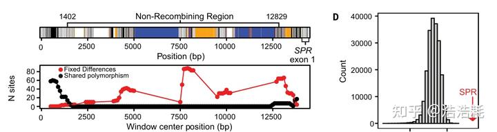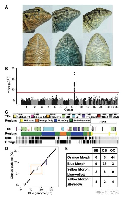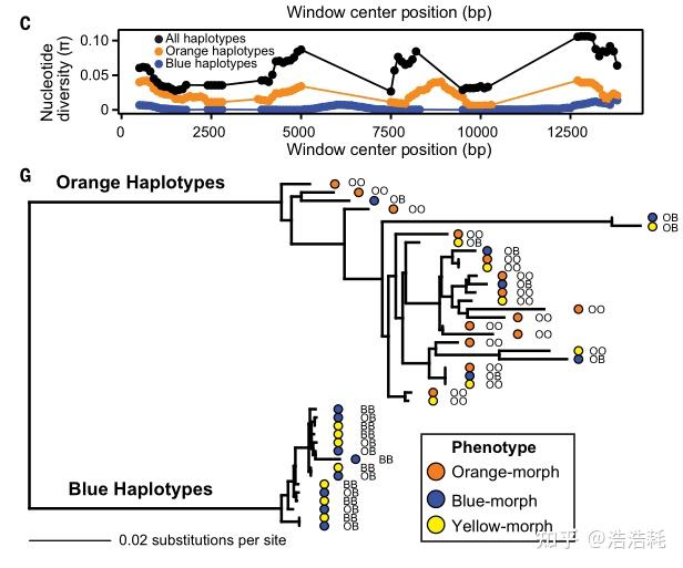 但这项研究通过基因组测序发现,事实并非如此!研究团队首先组装了橙色和蓝色形态的参考基因组,随后对 44 个橙色和 45 个蓝色个体进行全基因组关联分析,发现了仅在 SPR(sepiapterin reductase) 基因上游调控区域存在显著关联。进一步的测序分析揭示,橙色和蓝色形态分别与两种高度分化的单倍型(O 型和 B 型)紧密相关:所有橙色个体都是 O 型纯合子,而蓝色个体通常携带至少一个 B 型单倍型。值得注意的是,在该区域发现了大量转座元件插入,且两个单倍型之间几乎没有发生重组,表明这是一个长期受平衡选择维持的区域。