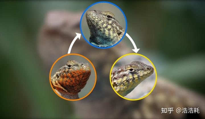 我先通俗的介绍一下侧斑鬣蜥的石头 - 剪刀 - 布博弈,我们可以把它想象成一场三种不同性格的“国王”之间的权力游戏。在这场游戏中,没有谁是绝对的弱者,也没有谁是永久的胜者,因为每种策略都恰好能克制其中一种,又被另一种所克制。基于它们三种不同的喉部颜色,我们可以给这三种蜥蜴分别起个代号,大橙、大蓝、和大黄。大橙是霸道总裁,个头大、侵略性强、睾酮水平高。大蓝和大黄都干不过它们,所以它们靠武力统治了大片领地,每个大橙都有一个“后宫”,能占有几十只雌性蜥蜴。而大蓝,属于纯爱战士,他们打不过大橙,所以地盘不大,但是领地的意识很强,同时他们也不贪多,每一个大蓝就守着自己的一两个妻子,所以因为看的紧,别的雄性也很难插足。