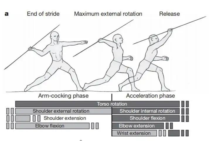 人在投掷的时候,力量从腿到臀部,再到躯干、肩膀、肘部、手腕,每个关节都通过扭矩进行加速……