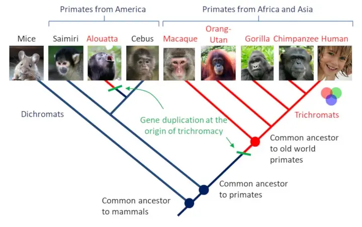 不过 3000 多万年前,在新世界猴和旧世界猴分化之际,X 染色体上的视蛋白基因发生了变异,重新发展出了三色视觉。