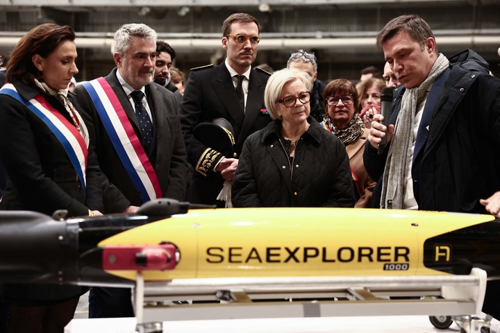 1月22日,法国国防部长卡特琳·沃特兰(中)在土伦参观军备局海军技术中心。(法新社)