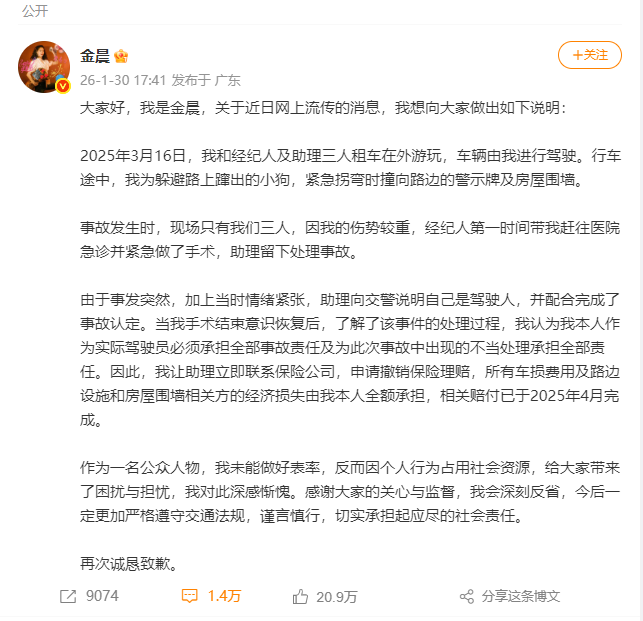 金晨在其社交账号中称:“由于事发突然,加上当时情绪紧张,助理向交警说明自己是驾驶人,并配合完成了事故认定。当我手术结束意识恢复后,了解了该事件的处理过程,我认为我本人作为实际驾驶员必须承担全部事故责任及为此次事故中出现的不当处理承担全部责任。因此,我让助理立即联系保险公司,申请撤销保险理赔,所有车损费用及路边设施和房屋围墙相关方的经济损失由我本人全额承担,相关赔付已于2025年4月完成。”