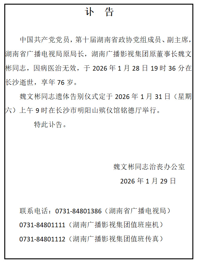 1月29日,湖南卫视官方微博发布消息,湖南省广播电视局原局长,湖南广播影视集团原董事长魏文彬,因病医治无效,于2026年1月28日19时36分在长沙逝世,享年76岁。