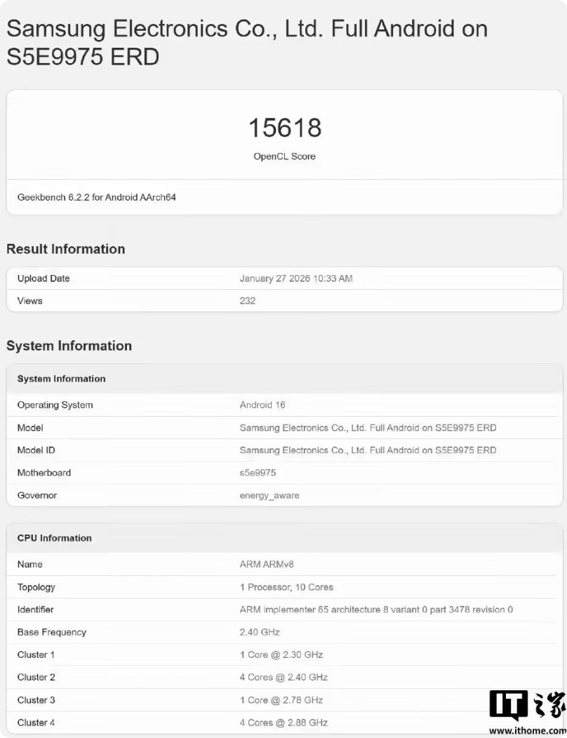 1 月 28 日消息,Geekbench 跑分平台 1 月 27 日出现了一款三星新处理器的信息,采用 10 核 CPU(四丛集 1+4+1+4 架构),疑似为三星下一代旗舰处理器 Exynos 2700(2600 为 1+3+6 架构)。