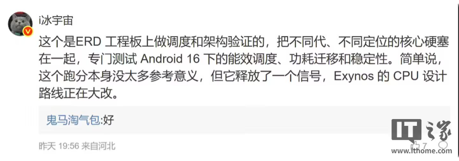 这个是 ERD 工程板上做调度和架构验证的,把不同代、不同定位的核心硬塞在一起,专门测试 Android 16 下的能效调度、功耗迁移和稳定性。简单说,这个跑分本身没太多参考意义,但它释放了一个信号,Exynos 的 CPU 设计路线正在大改。