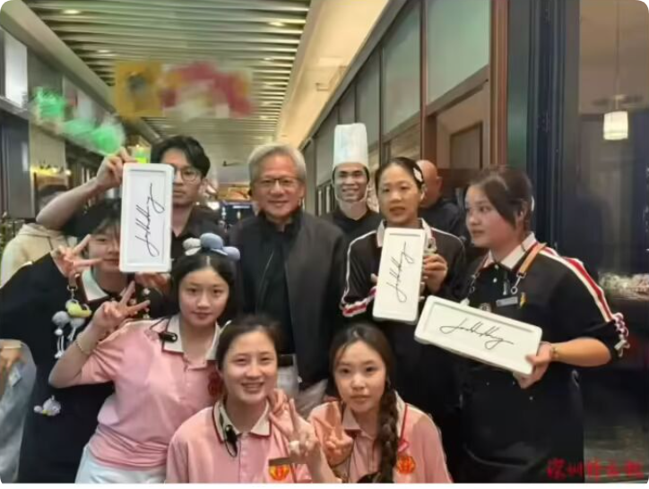 离店前,黄仁勋应店员请求合影留念,并在餐盘上签名,期间多次称赞“深圳的牛肉很新鲜,很好吃”,并表示将再次光顾。